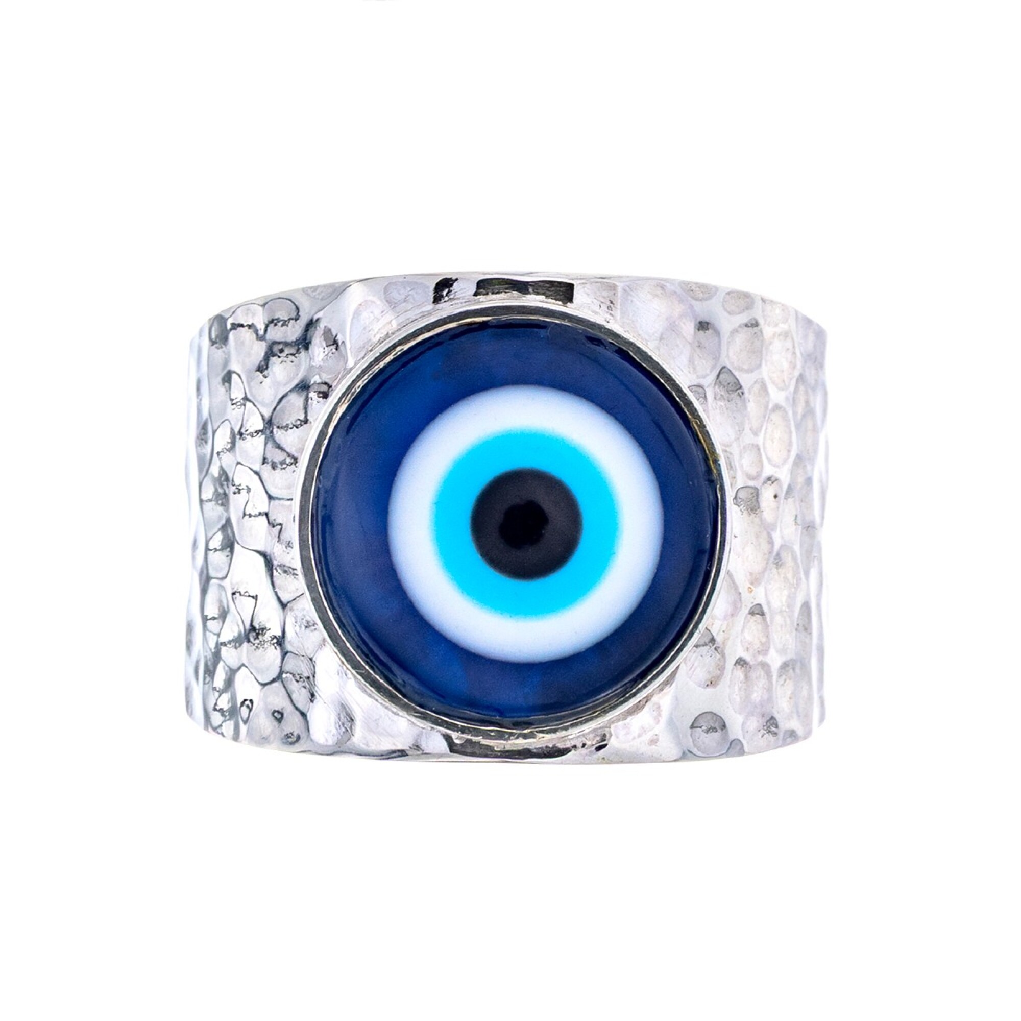 Es un anillo hecho a mano de 1.5 cm de ancho, textura martillada con ojo turco central. Puedes elegir textura que te guste.